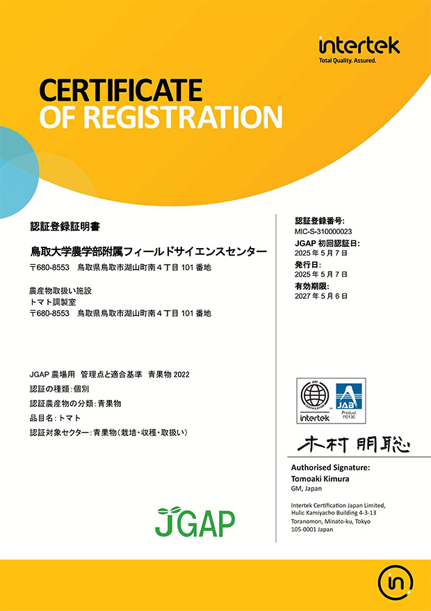 農学部附属フィールドサイエンスセンター(FSC)では,FSC教員と技術職員の協力により,トマト栽培の生産から出荷までの工程において,JGAP認証を取得しました(2025年5月).GAPはGood Agricultural Practicesと表記し,日本語では農業生産工程管理や適正農業規範などと訳されます.似たような制度として民間企業のISOが有名ですが,ISOは企業活動全般における組織の品質・環境・労働安全などの管理向上を担保する国際標準規格です.農業のGAPでは,認証の基準は国や業界ごとに異なりますが,農業の現場や食品の生産工程における食の安全や環境負荷軽減,持続可能な農業などの取り組みを担保する認証制度です.今回取得した認証はJGAPと言われ,この認証取得により,FSCのトマト栽培では,品質管理の向上,食品安全性の確保,持続可能性の推進などの基準をクリアし,さらに学生の農場実習では認証までの手法と基準を満たすための生産管理工程を学ぶことができるようになりました.