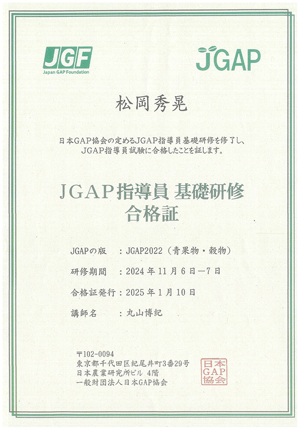 また認証取得のため,技術部生物生産管理部門生物生産管理分野の松岡技術専門職員はJGAP指導員の資格を取得しました(2025年1月).JGAP指導員とは,農場がJGAP認証を取得・維持するための指導や相談を行う専門家です.その主な役割は,農場への指導,審査準備の支援,継続的な改善の助言,最新情報の提供などがあり,認証取得に向けて書類作成など実務のアドバイスや現場の指導が可能になりました.経験を積むことで上級指導員として登録することも可能であり,ますますの活躍が期待されます.